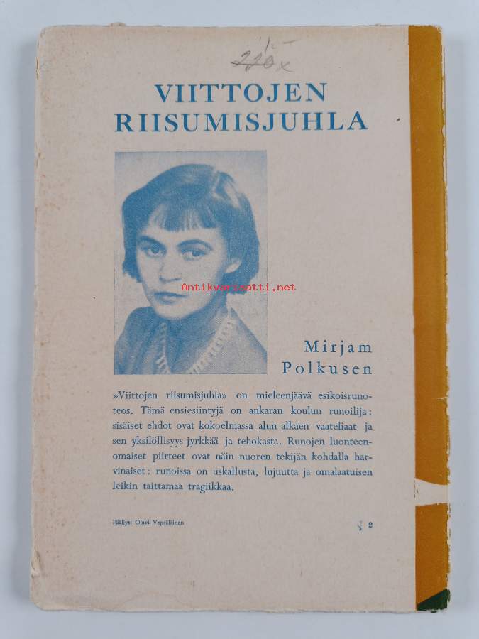 Tyydyttävä. Tarkempi kuntoluokka: K2+ ; Jonkin verran kulumaa, pienoista repeämää etukannen yläkulmassa, hieman taitejälkeä takakannessa, pienoista läikkää. etukannessa pieni pintarepeämä