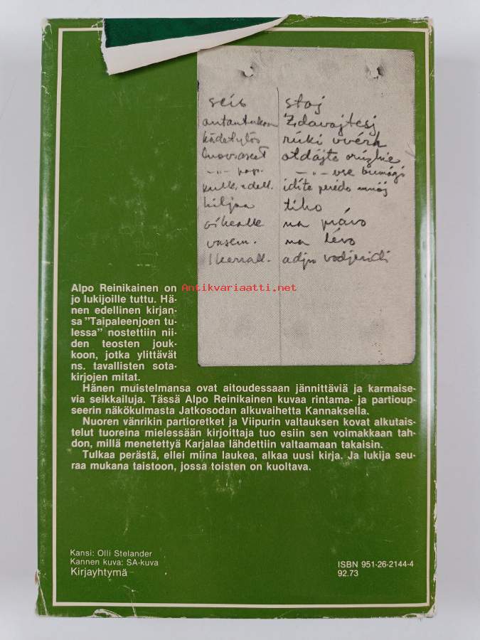 Hyvä. Pienoista kolhua selkämyksen yläreunassa, selkämyksessä vinoutta. Kansipaperin kunto: joitain repeämiä/kulumaa