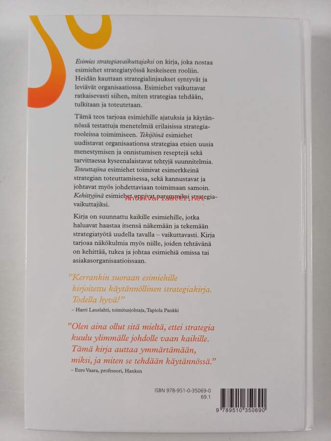 Muu(t) tekijä(t): Kimmo Suominen, Virpi Hämäläinen ym.Sarja: WSOYProAsiasanat: yritykset, johtaminen, päätöksenteko, yritysstrategiat, vaikuttaminen, esimiehet, organisaatiot, alaiset, strateginen suunnittelu, strateginen johtaminen, strategiat, toteutus, esimerkit, esihenkilöt