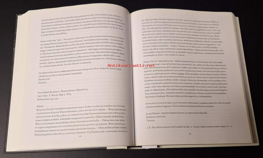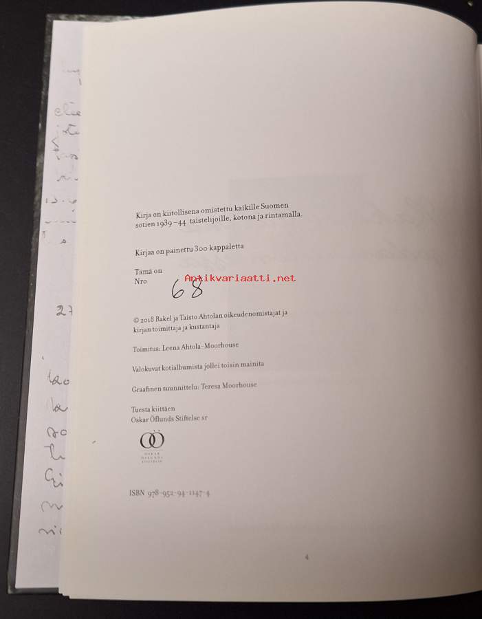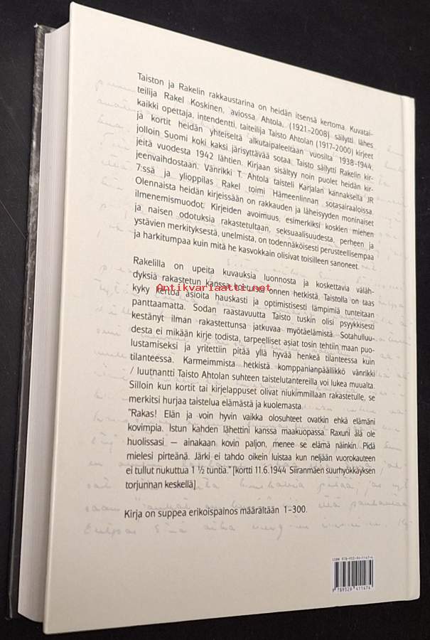 Numeroitu 68/300: "Taiston ja Rakelin rakkaustarina on heidän itsensä kertoma. Kuvataiteilija Rakel Koskinen, aviossa Ahtola, (1921–2008) säilytti lähes kaikki opettaja, intendentti, taiteilija Taisto Ahtolan (1917-2000) kirjeet ja kortit heidän yhteiseltä alkutaipaleeltaan vuosilta 1938-1944, jolloin Suomi koki kaksi järisyttävää sotaa. Taisto säilytti Rakelin kirjeitä vuodesta 1942 lähtien. Kirjaan sisältyy noin puolet heidän kirjeenvaihdostaan. Vänrikki T. Ahtola taisteli Karjalan kannaksella JR 7:ssä ja ylioppilas Rakel toimi Hämeenlinnan sotasairaaloissa. Olennaista heidän kirjeissään on rakkauden ja läheisyyden moninaiset ilmenemismuodot."