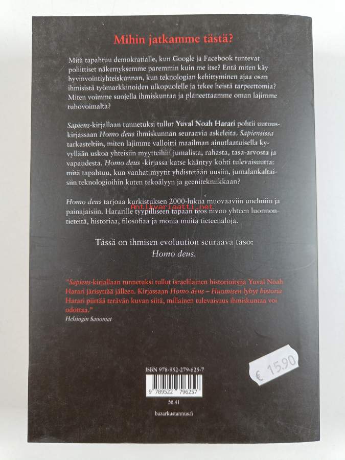 Muu(t) tekijä(t): Jaana Iso-MarkkuAlkuteos: Historyah shel ha-mahar / Homo Deus. A Brief History of TomorrowAsiasanat: ihminen, evoluutio, ihmiskunta, tulevaisuudentutkimus, tulevaisuus, evoluutioteoria, teknologinen kehitys, teknologia, sivilisaatio, biologinen antropologia, antroposeeni