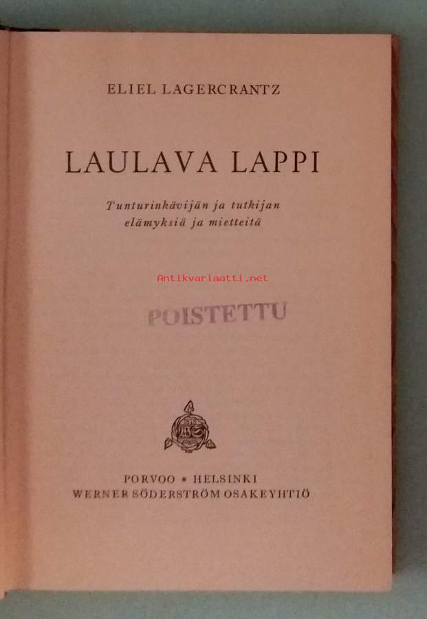 Teos koostuu mm. kirjoittajan henkilökohtaisia kokemuksia Lapin tuntureilta + havaintoja saamelaisista, markkinoista ja uskonnollisista vaikuttajista + tutkimusta Lapin luonnosta ja saamen kielestä. Dimensiot 20 ¤ 14 cm. Kuvitettu. Leima: POISTETTU. Ei muita merkintöjä.