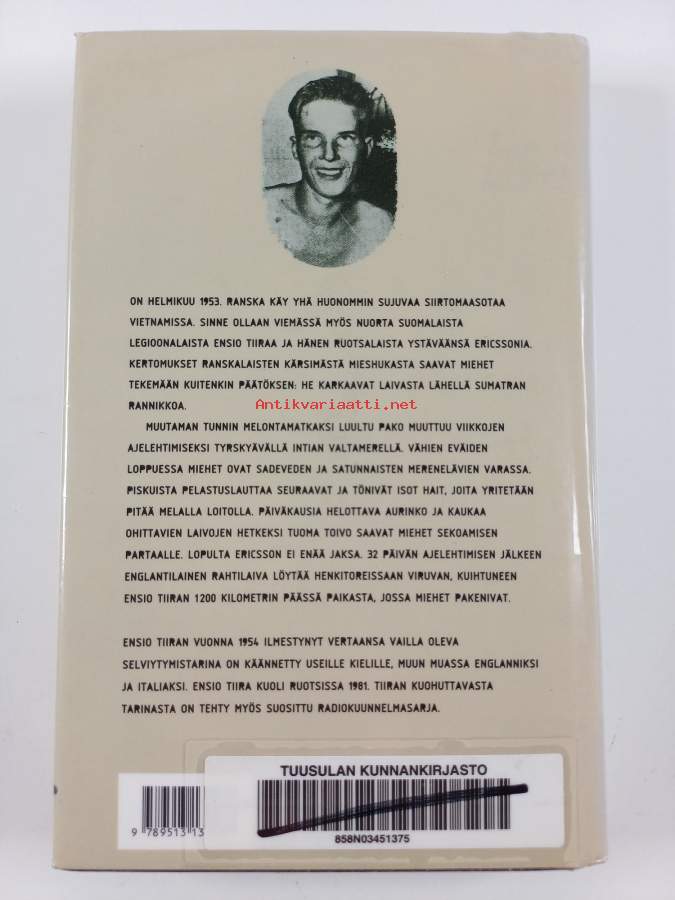 Huonokuntoinen (lukukelpoinen). Tarkempi kuntoluokka: K1+ ; Selkämyksessä hieman vinoutta, kontaktimuovipäällystys, kirjaston poistokirja, sidos löystynyt ja näkyvissä. kannet puoliksi irronneet,sivujen reunoilla jonkin verran läikkää/aaltoilua