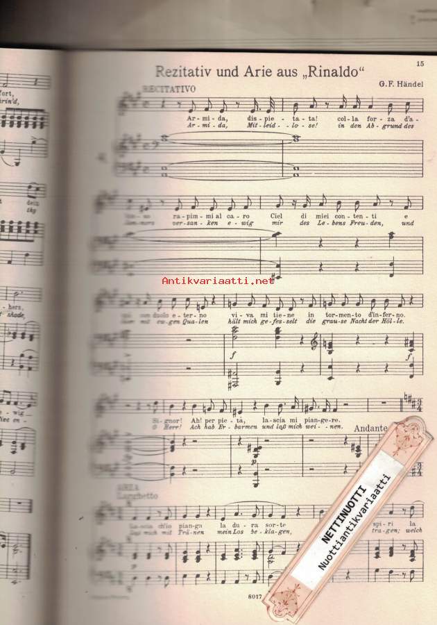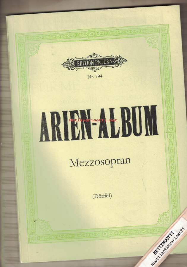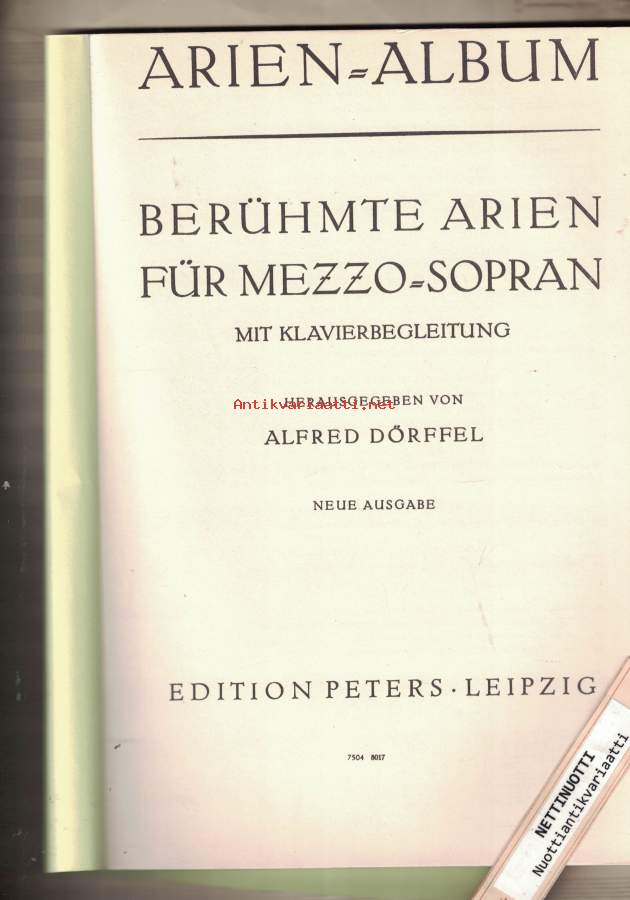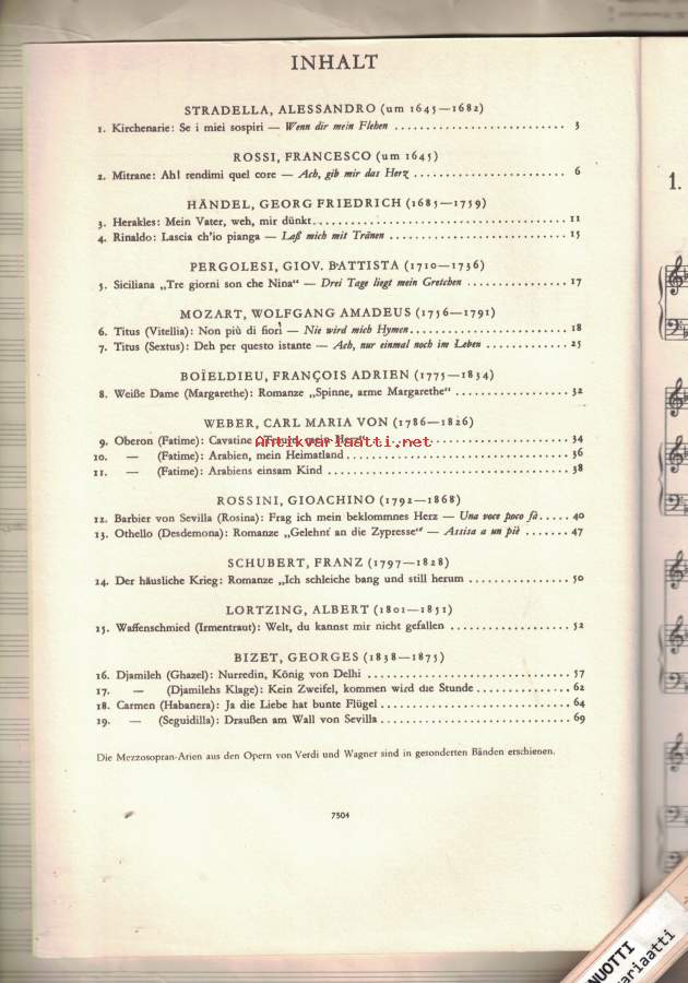 Alessandro StradellaKirchenarie Se i miei sospiri" / "Wenn dir mein Flehen""Ah! rendimi quel core / Ach! gib das Herz zurück mir""aus: Mitrane (Rossi, Francesco, um 1645)Georg Friedrich HändelMein Vater! Weh! mir dünkt, ich seh Es-Duraus: HeraklesGeorg Friedrich HändelLascia ch'io pianga / Laß mich mit Tränen""aus: RinaldoGiovanni Battista PergolesiSiciliana Tre giorni son che Nina" / "Drei Tage liegt mein Gretchen""Wolfgang Amadeus MozartRondo Vitellia Non più di fiori" / "Nie wird mich Hymen""(aus: Titus, Zweiter Akt / Fünfzehnte Szene Nr. 23)Wolfgang Amadeus MozartRondo Sesto Deh per questo istante" / "Ach, nur einmal noch im Leben""(aus: Titus, Zweiter Akt / Zehnte Szene Nr. 19)François-Adrien BoieldieuRomanze der Margarethe, Spinne arme Margarethe""aus: Die Weiße DameCarl Maria von WeberKavatine der Fatime, Traure, mein Herz, um verschwundenes Glück!""aus: OberonCarl Maria von WeberArie der Fatime, Arabien, mein Heimatland""aus: OberonCarl Maria von WeberAriette der Fatime, Arabiens einsam Kind""(aus: Oberon)Gioacchino RossiniKavatine der Rosina, Frag ich mein bekommnes Herz""aus: Der Barbier von SevillaGioacchino RossiniRomanze der Desdemona, Assisa a un piè d'un salice" / "Gelehnt an die Cypresse""aus: OthelloFranz SchubertRomanze der Helene, Ich schleiche bang und still herum" f-Moll D 787 Nr. 2 (April 1823)"aus: Die Verschworenen (Der häusliche Krieg), Singspiel (Originaltonart, Tonumfang es' - f'')Albert LortzingAriette der Irmentraut, Welt, du kannst mir nicht gefallen""aus: Der WaffenschmiedGeorges BizetGhazel Nurredin, König von Delhi""aus: DjamilehGeorges BizetDjamilehs Klage, Kein Zweifel, kommen wird die Stunde""aus: DjamilehGeorges BizetHabanera der Carmen, Ja, die Liebe hat bune Flügel""aus: CarmenGeorges BizetSeguidilla der Carmen, Draußen am Wall von Sevilla""aus: Carmen-Suuri Helposti kuori