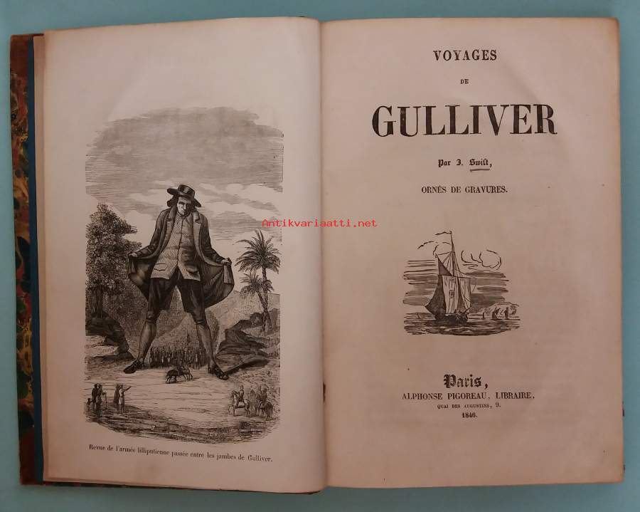 Kyseessä on 1846 Pigoreau’n ranskankielinen Gulliver-painos, kuvitettu, in‑8, ei ensimmäinen ranskankielinen painos, vaan 1800-luvun puolivälin kaupallinen, mutta nykyään keräilykelpoinen laitos. Dimensiot 23 ¤ 16 cm. Kuvitettu. Kyseessä on (sivuja 299 ) täysimittainen ranskankielinen käännös. Kokonaisuuden kuntoluokka: Bon exemplaire, reliure romantique en bon état, quelques frottements d’usage.