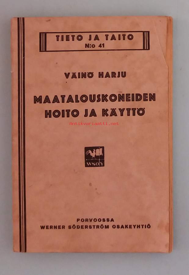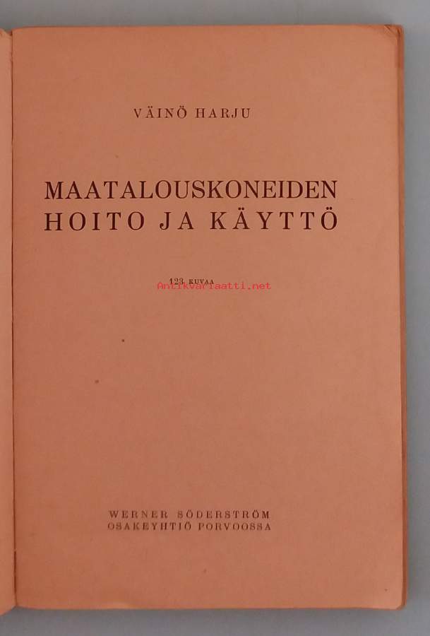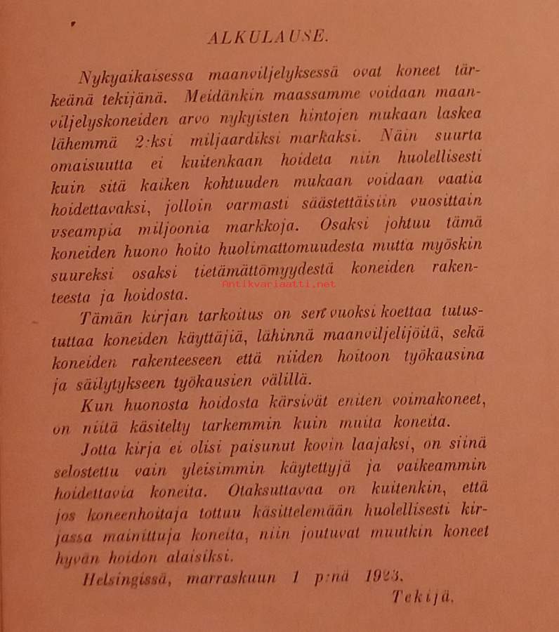 Sisältö keskittyy erilaisten maatalouskoneiden seikkaperäiseen käytönopastukseen ja hoitoon. Teos käsittelee myös polttomoottoreita, lokomobiilejä ja traktoreita Kuvitettu. Dimensiot 18 ¤ 12 cm.