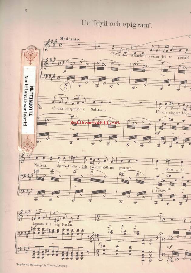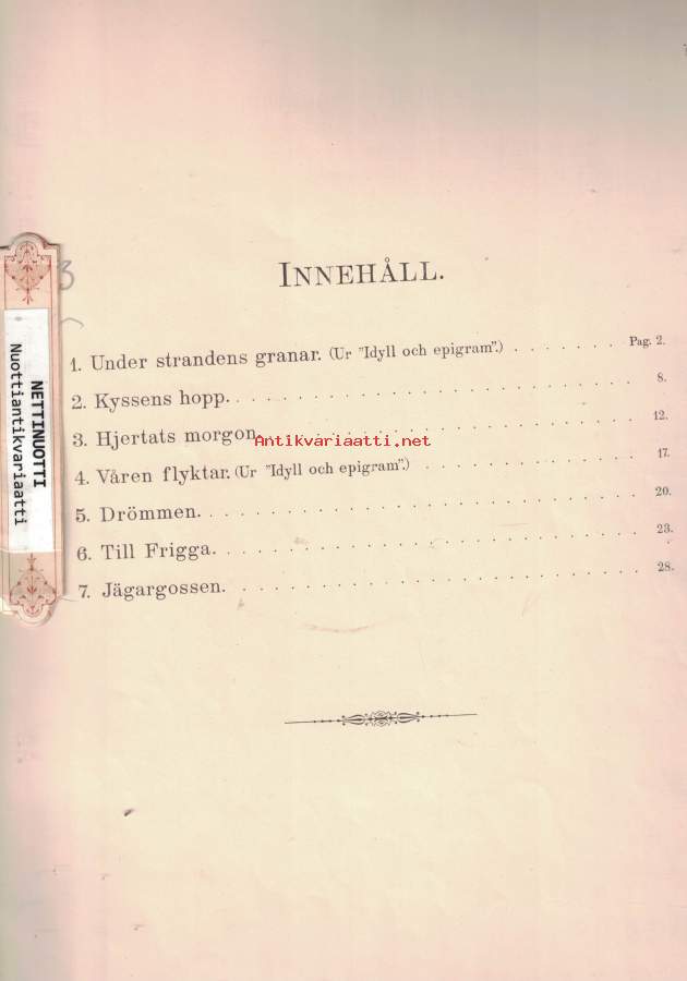 1. Under strandens granar 2. Kyssens hopp 3. Hjertats morgon 4. Våren flyktar (Ur Idyll och epigram) 5. Drömmen 6. Till Frigga 7. Jägargossen n. 27x34 cm. -Postitus pakettina.