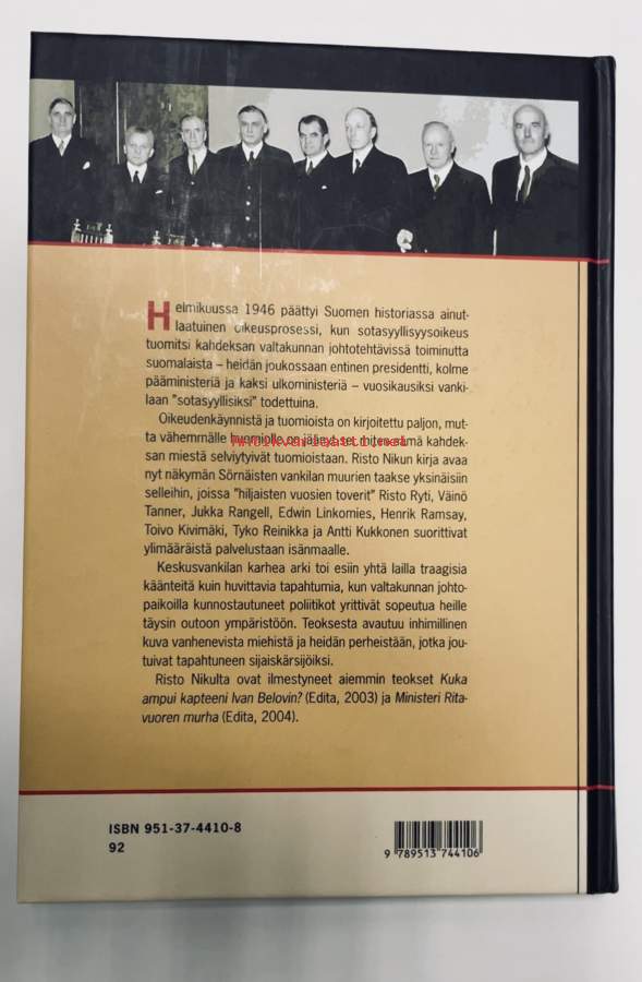 Helmikuussa 1946 päättyi Suomen historiassa ainutlaatuinen oikeusprosessi, kun sotasyyllisyysoikeus tuomitsi kahdeksan valtakunnan johtotehtävissä toiminutta suomalaista – heidän joukossaan entinen presidentti, kolme pääministeriä ja kaksi ulkoministeriä – vuosikausiksi vankilaan ”sotasyyllisiksi” todettuina. Oikeudenkäynnistä ja tuomioista on kirjoitettu paljon, mutta vähemmälle huomiolle on jäänyt se, miten nämä kahdeksan miestä selviytyivät tuomioistaan. Risto Nikun kirja avaa nyt näkymän Sörnäisten vankilan muurien taakse yksinäisiin selleihin, joissa ”hiljaisten vuosien toverit” Risto Ryti, Väinö Tanner, Jukka Rangell, Edwin Linkomies, Henrik Ramsay, Toivo Kivimäki, Tyko Reinikka ja Antti Kukkonen suorittivat ylimääräistä palvelustaan isänmaalle.