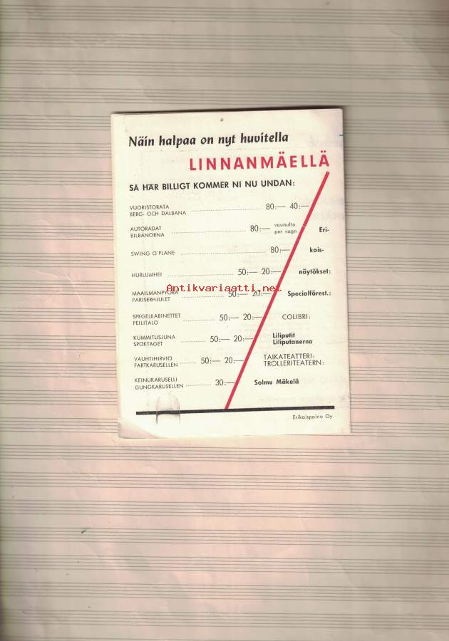 Taitettu Linnanmäen hinnasto / esite, sisäaukeamalla Peacockin kesäkuun ohjelma + lippujen hinnat