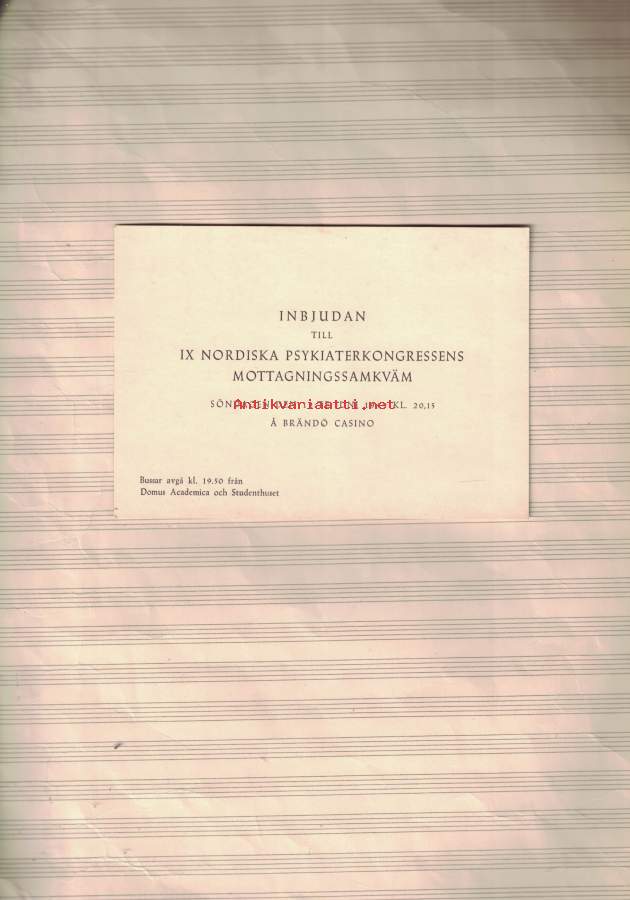 Inbjudan till Nordiska Psykiaterkongressens mottagningssamkväm å Brandö Casino