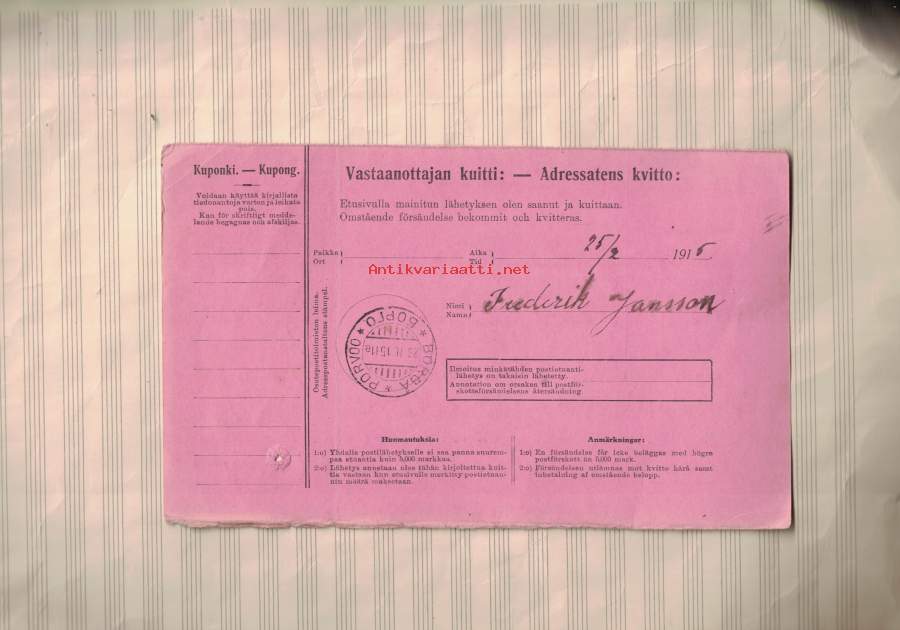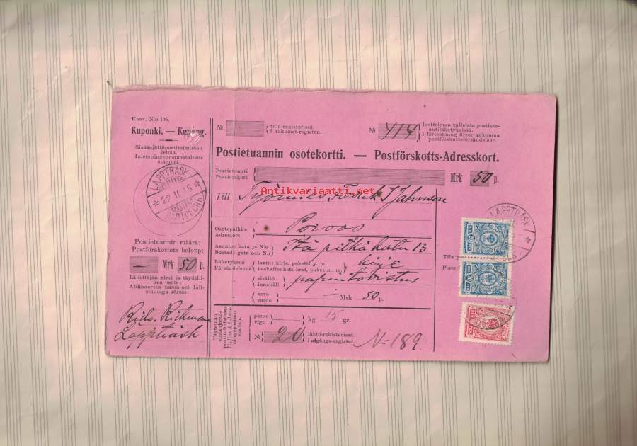 Postietuannin osotekortti Lappträsk - Porvoo 1915