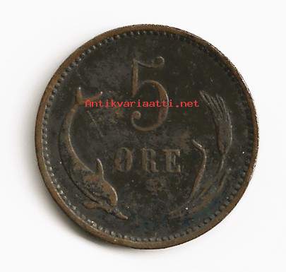Liikkeeseenlaskija Tanska Kuningas Kristian IX (1863–1906)Tyyppi VakiokiertokolikotVuodet 1874-1906Arvo 5 Øre (0.05 DKK)Valuutta Krone (1873–nykyhetki)Koostumus PronssiPaino 8 gHalkaisija 27 mmPaksuus 1,7 mmMuoto KierrosTekniikka JyrsittySuuntaus Mitalien kohdistus ↑↑Demonetisoitu 30. kesäkuuta 1989Numero N#4145ApuaViitteet KM#794, Schön# 3, DNF# 3.1, 3.2