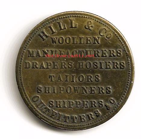Tämä on Hill & Co:n mainosmerkki (advertising token) Sunderlandista, Yhdistyneestä kuningaskunnasta. Se on valmistettu messingistä ja sen halkaisija on noin 34 mm. Yritys: Hill & Co.Toimiala: Villatuotteiden valmistajat, kankaiden myyjät, sukkatavaroiden myyjät, räätälit, laivanomistajat, rahtaajat ja varustajat.Sijainti: Newcastle, North Shields ja Sunderland.Perustettu: 1825.