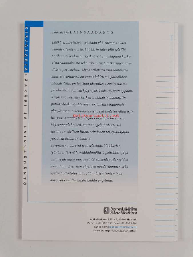 Muu(t) tekijä(t): Pentti Ahola, Pekka SaukkoSarja: Suomen lääkäriliiton kirjasarjaAsiasanat: lainsäädäntö, lääkärit, vastuu, potilaat, oikeusturva, oikeusvarmuus, physicians, legislation, patienter, lagstiftning, läkare, rättsskydd, Legislation, Medical, ansvar, rättssäkerhet