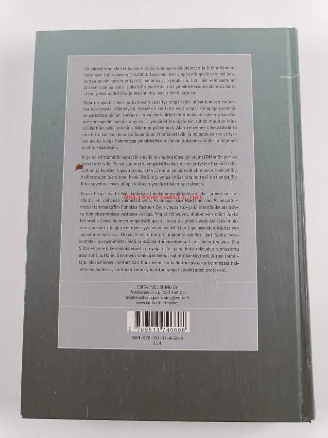 Muu(t) tekijä(t): Kari Kuusiniemi, Jukka LeinonenMerkinnät: omistajamerkintäSarja: Evolutio legisAsiasanat: rakentaminen, lainsäädäntö, ympäristönsuojelu, luonnonsuojelu, kaavoitus, vesiensuojelu, ympäristöhallinto, ympäristöoikeus, EY-oikeus, valvonta, ympäristörikokset, korvausvastuu, ympäristöluvat, muutoksenhaku, ympäristövahingot, EU-direktiivit, miljöskydd, lagstiftning, miljörätt, ympäristönsuojelulaki, ympäristönsuojeluhallinto, vesilaki