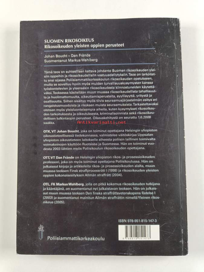 Muu(t) tekijä(t): Markus Wahlberg, Dan FrändeMerkinnät: omistajamerkintäSarja: Poliisiammattikorkeakoulun oppikirjat 17/2008Alkuteos: Finsk straffrättAsiasanat: lainsäädäntö, syyllisyys, rikokset, rikollisuus, käsitteet, rikosoikeus, rangaistukset, hätävarjelu, laiminlyönti, osallisuus, laintulkinta, seuraamukset, rikoksen yritys