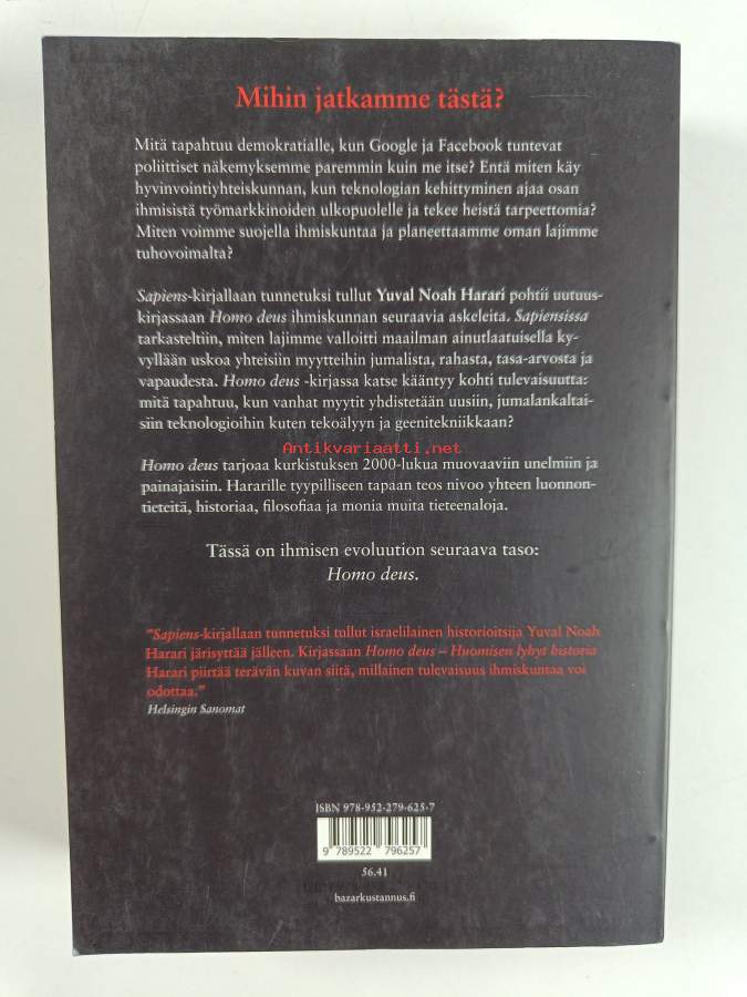 Muu(t) tekijä(t): Jaana Iso-MarkkuAlkuteos: Historyah shel ha-mahar / Homo Deus. A Brief History of TomorrowAsiasanat: ihminen, evoluutio, ihmiskunta, tulevaisuudentutkimus, tulevaisuus, evoluutioteoria, teknologinen kehitys, teknologia, sivilisaatio, biologinen antropologia, antroposeeni