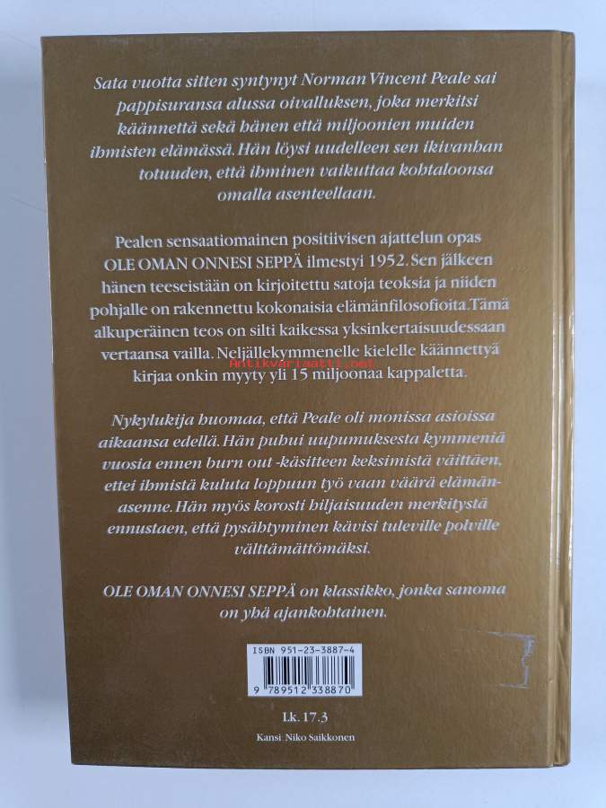 Hyvä. Tarkempi kuntoluokka: K3+ ; Hieman kulumaa, takana hintalapun jäämää, selkämyksessä hieman vinoutta. takakannen sisäpuolella tarrahälytin