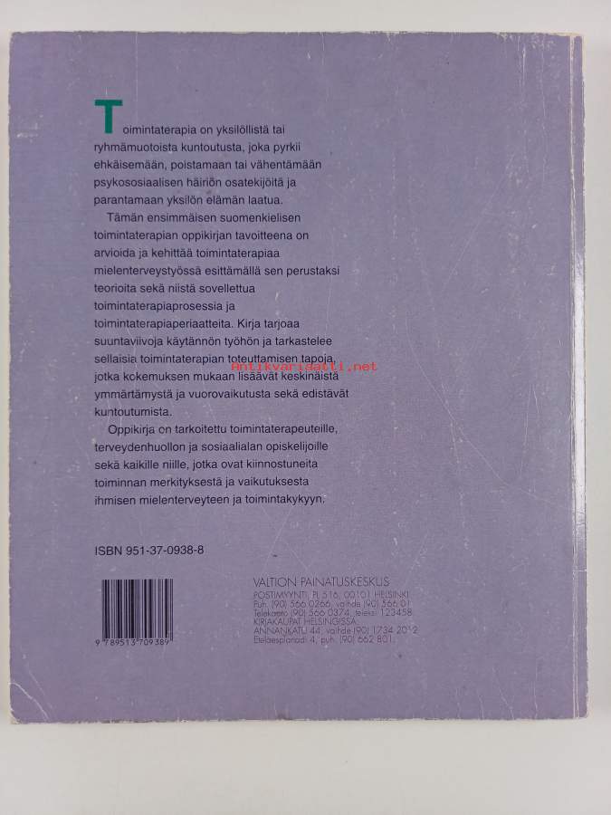 Muu(t) tekijä(t): Päivi Tiihonen, Sisko Salo-Chydenius ym.Asiasanat: historia, mielenterveys, hoitomenetelmät, nuoret, filosofia, mielenterveyshäiriöt, päihteet, psykoterapia, terapeutit, kuntoutus, ammatillinen kehitys, masennus, neuroosit, potilaat, skitsofrenia, ikääntyneet, päihdehuolto, mielenterveystyö, toimintakyky, toimintaterapia, lapset (ikäryhmät), lääkinnällinen kuntoutus, mental health services, Mental Disorders, Mental Health, Occupational Therapy, toimintaterapeutit, occpational therapy