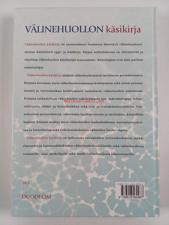 Muu(t) tekijä(t): Toivo Aarnio, Jaana Helenius ym.Asiasanat: palvelut, lainsäädäntö, huolto, terveydenhuolto, lääkintälaitteet, hygienia, työmenetelmät, välineet, laadunhallinta, terveysala, Hygiene, skötsel, kvalitetsstyrning, hälso- och sjukvård, lagstiftning, sairaalatekniikka, hygien, tjänster (service), hälsovårdsbranschen, redskap, Disinfection, Equipment and Supplies, Sterilization, sterilointi (puhdistus), välinehuoltajat, medicinteknisk utrustning, sjukhusteknik, sterilisering (rengöring), arbetsmetoder, instrumentvårdare