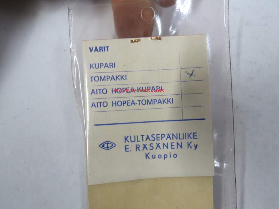 Raju - Kultasepänliike E. Räsänen Ky, Kuopio -pilkki, väri "Tompakki", käyttämätön, alkuperäispakkauksessaan