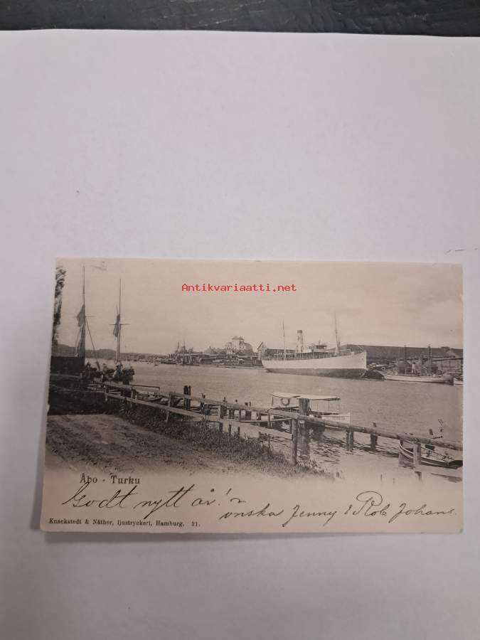 Postikortti: Todella vanha uuden vuoden kortti. Takana N:O 77/ 8. Herra Oiva Johansson on saanut kortin kai käteen tms.