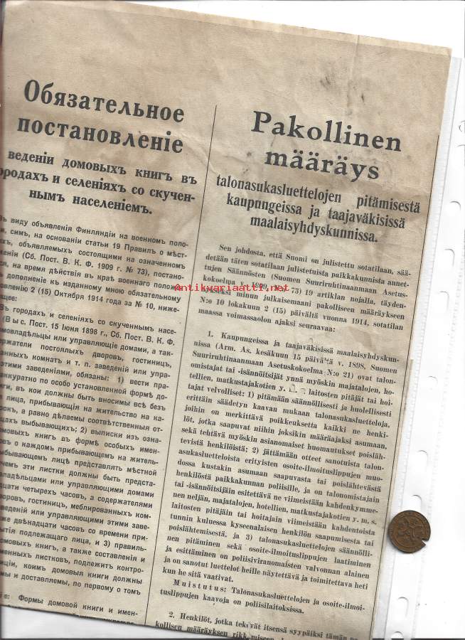 Pakollinen määräys -talonasukasluettelojen pitämisestä kaupungeissa,,,... / 1914 venäjäksi, suomeksi ja ruotsiksi