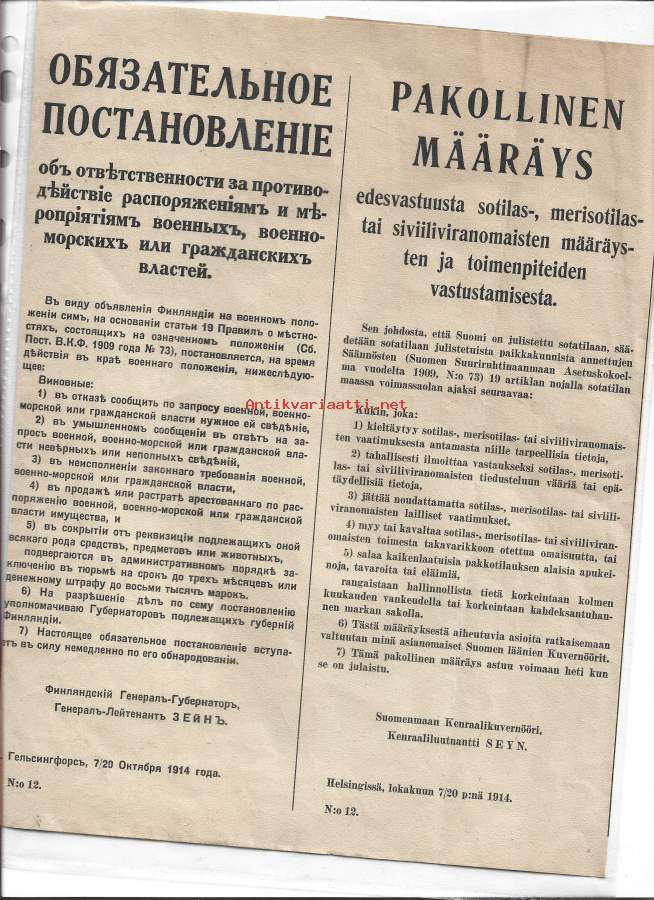 Pakollinen määräys -edesvastuusta sotilas-, merisotilas- tai siviiliviranomaisten määräysten vastustamisesta ..... / 1914 venäjäksi, suomeksi ja ruotsiksi