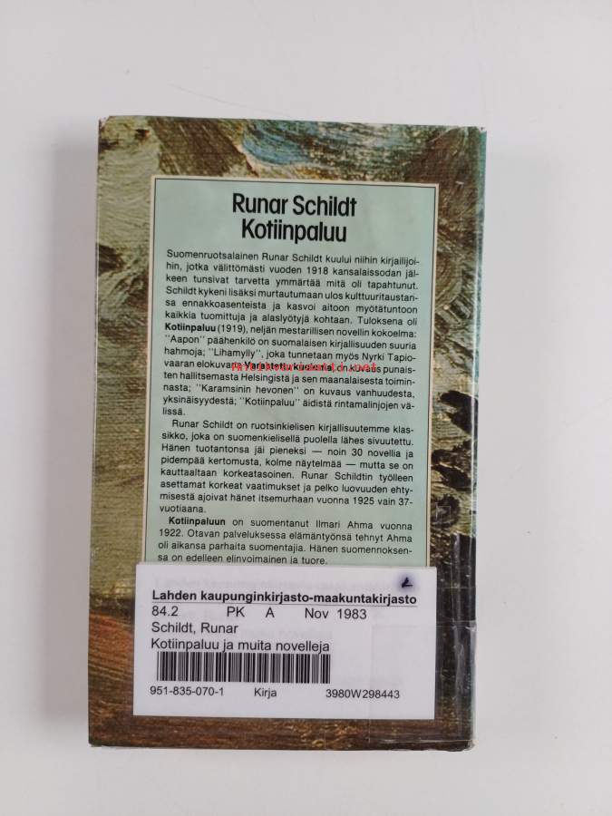 Tyydyttävä. Hieman kulumaa kansissa, selkämyksessä hieman vinoutta, kontaktimuovipäällystys, kirjaston poistokirja