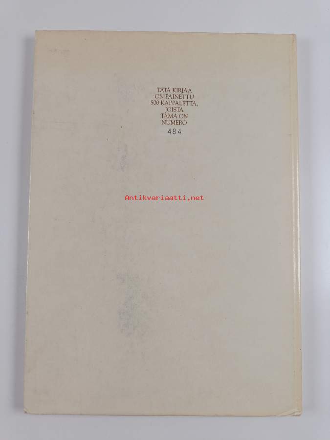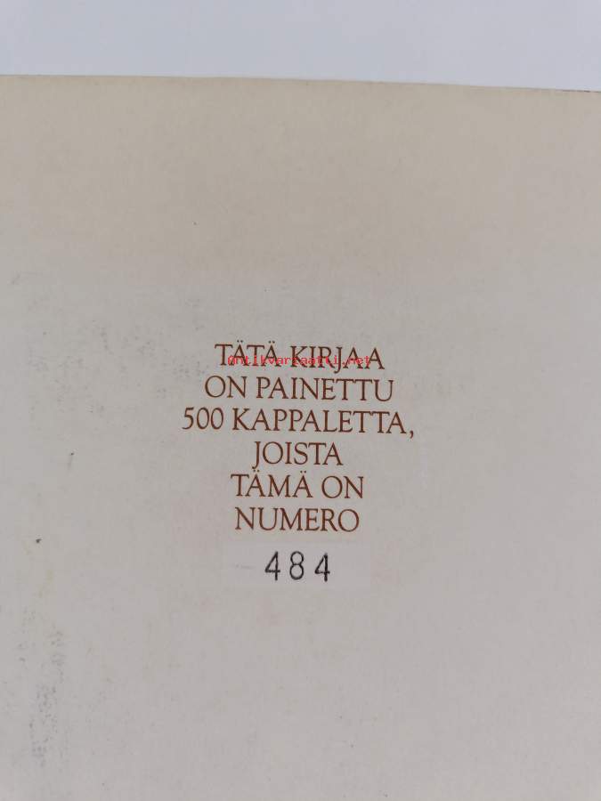 Hyvä. Tarkempi kuntoluokka: K3- ; Hieman kulumaa, pienoista kolhua reunoilla ja kulmissa, hieman nuhruisuutta kansissa. tätä teosta on painettu 500 kpl, joista tämä on numero 484
