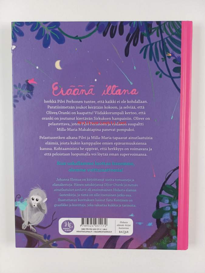 Muu(t) tekijä(t): Satu Kontinen, Johanna ElomaaSarja: Hidasta elämääAsiasanat: eläimet, sankaruus, pelot, rohkeus, perhoset, sieppaukset, seikkailu, herkkyys (psykologia), pelastaminen, orangit