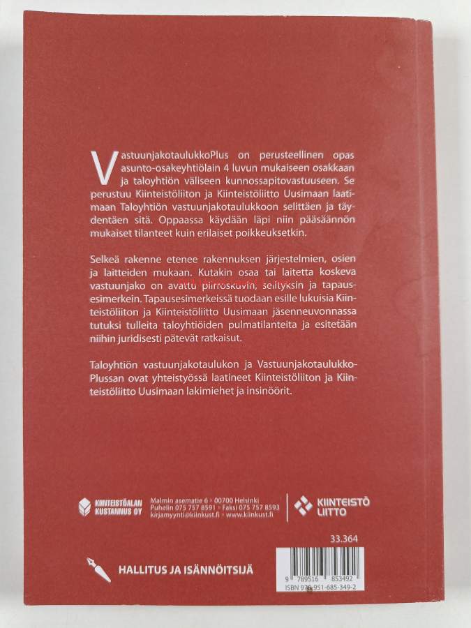 Sarja: Kiinteistöliiton julkaisut; Hallitus ja isännöitsijäAsiasanat: lainsäädäntö, kiinteistöt, asunto-osakeyhtiöt, vastuu, asunnot, huoneistot, osakkaat, kiinteistöosakeyhtiöt, asunto-osakeyhtiölaki, kunnossapito, vahingonkorvausvastuu, muutostyöt, ilmanvaihtojärjestelmät