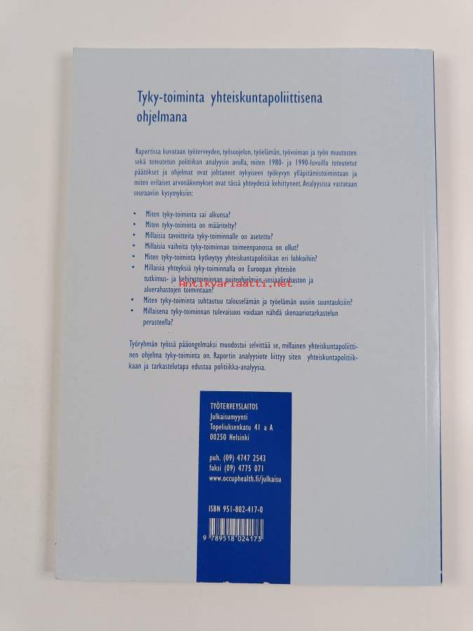Muu(t) tekijä(t): Jorma JärvisaloSarja: Työkyvyn ylläpidon tutkimus ja arviointi Raportti 4Asiasanat: työterveys, työkyky, kuntoutus, sosiaalipolitiikka, terveyspolitiikka, työsuojelu, koulutuspolitiikka, ft: työkykyä ylläpitävä toiminta