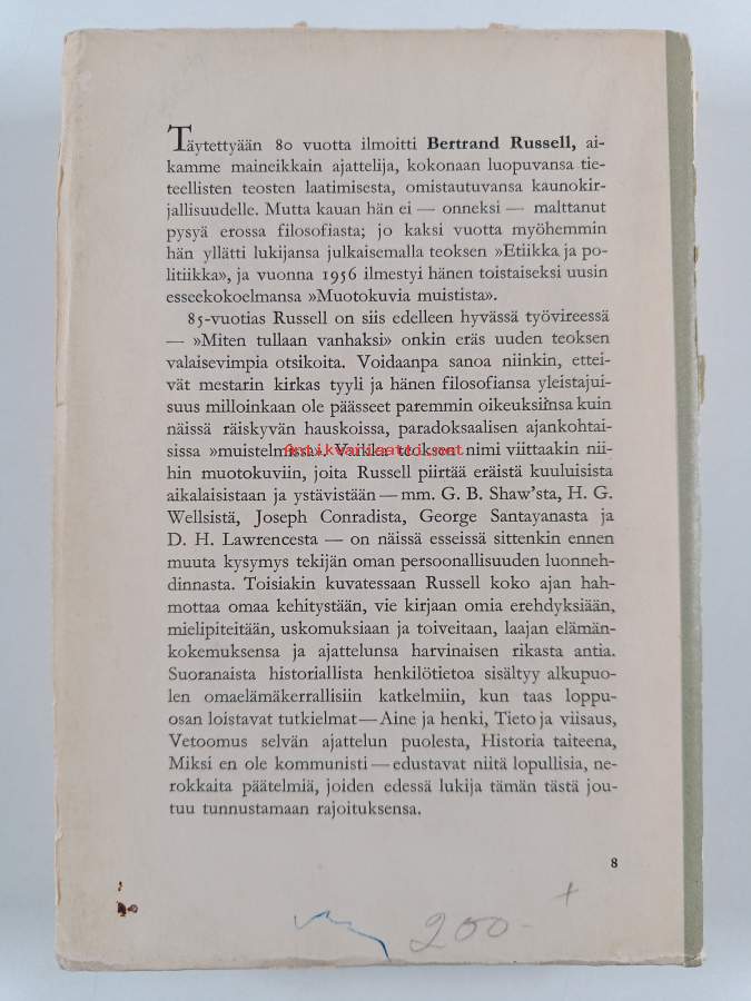 Muu(t) tekijä(t): J. A. HolloMerkinnät: omistajamerkintä leikattu pois etulehden ylälaidastaAlkuteos: Portraits from memory and other essaysAsiasanat: elämäkerrat, esseet, filosofia