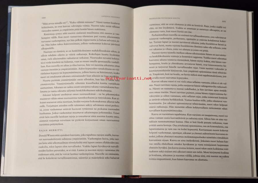 Nuorisopsykiatrin (Aalberg) ja lastenlääkärin (Siimes) teos, joka heijastelee oman aikansa käsityksiä vuosituhannen vaihteen tienoilta.