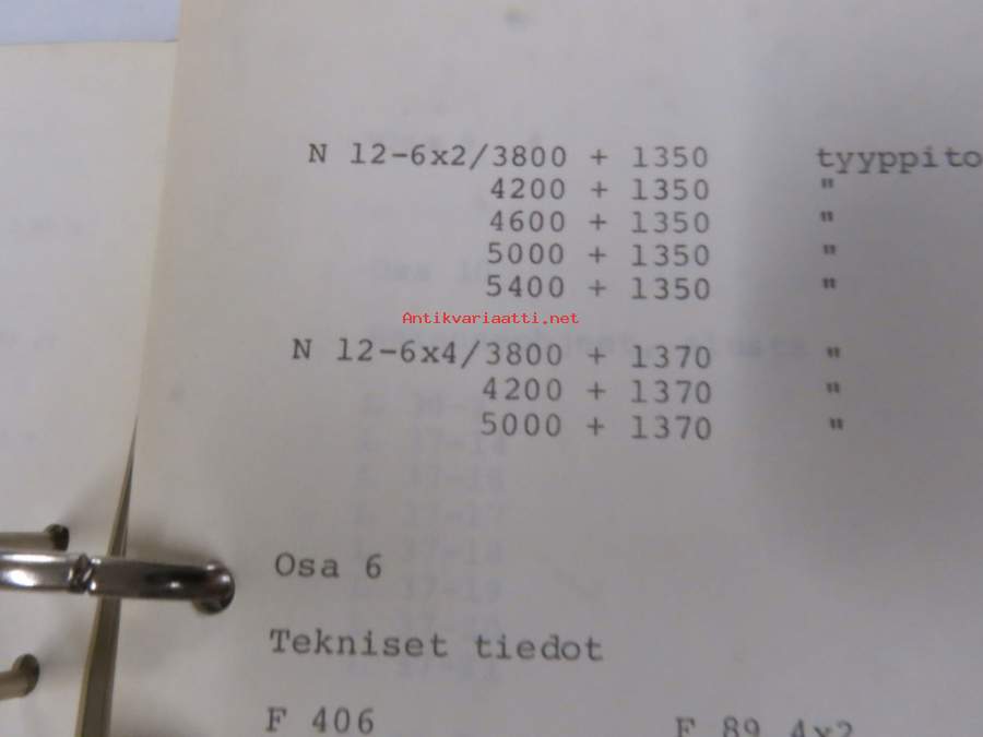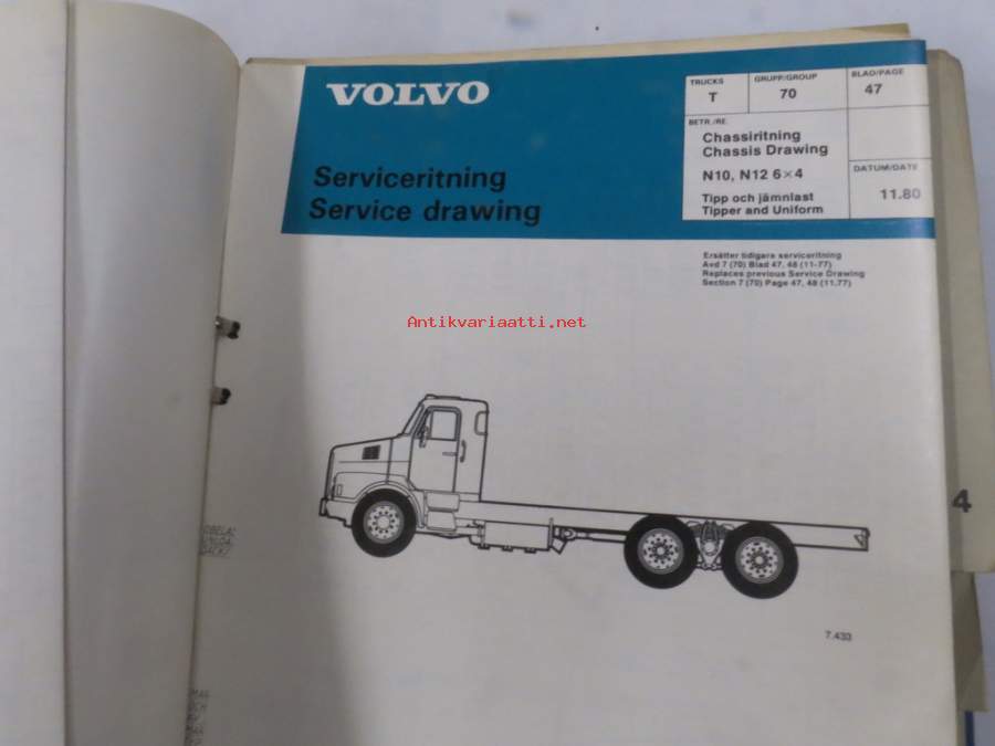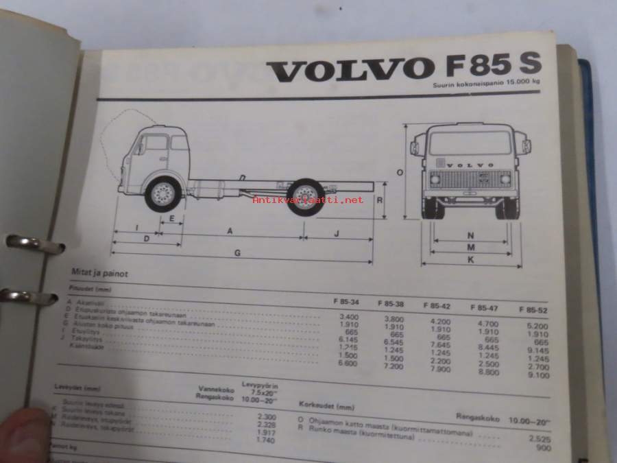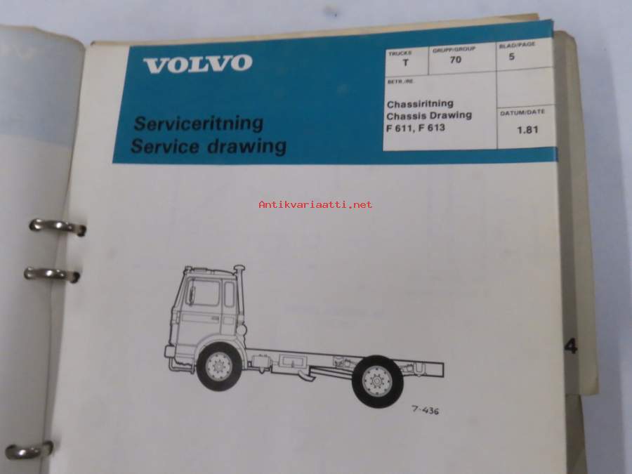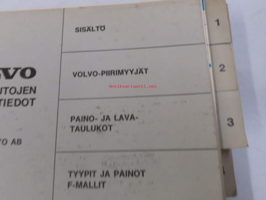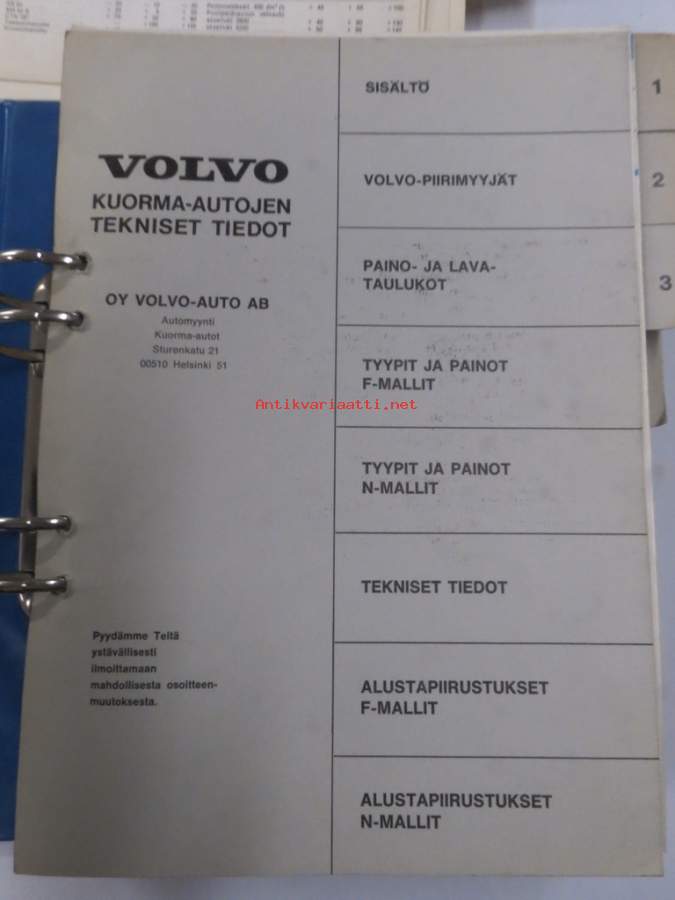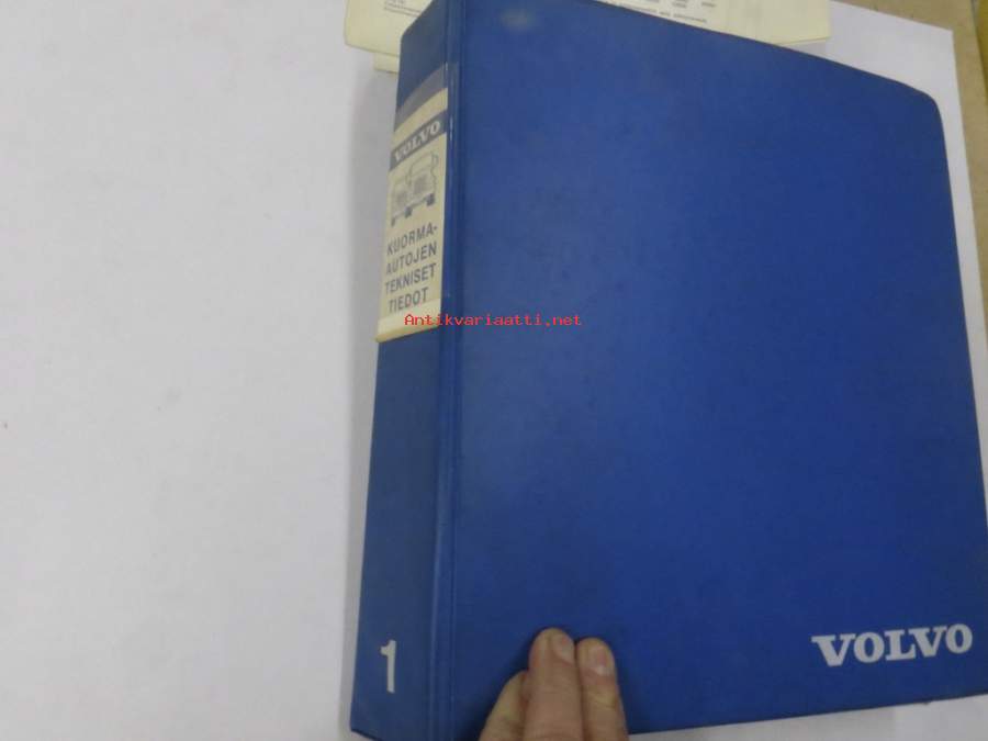 Volvo kuorma-autojen tekniset tiedot -kansio, sisältää myös tyyppikatsastustodistuksia, huoltotiedotuksia ym. ison määrän