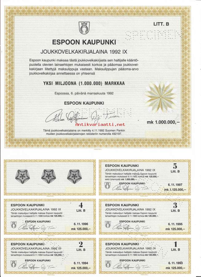 Espoon kaupunki Joukkovelkakirjalaina 1992 IX , 1 000 000 mk Espoo 6.11.1992 specimen - joukkovelkakirjalaina