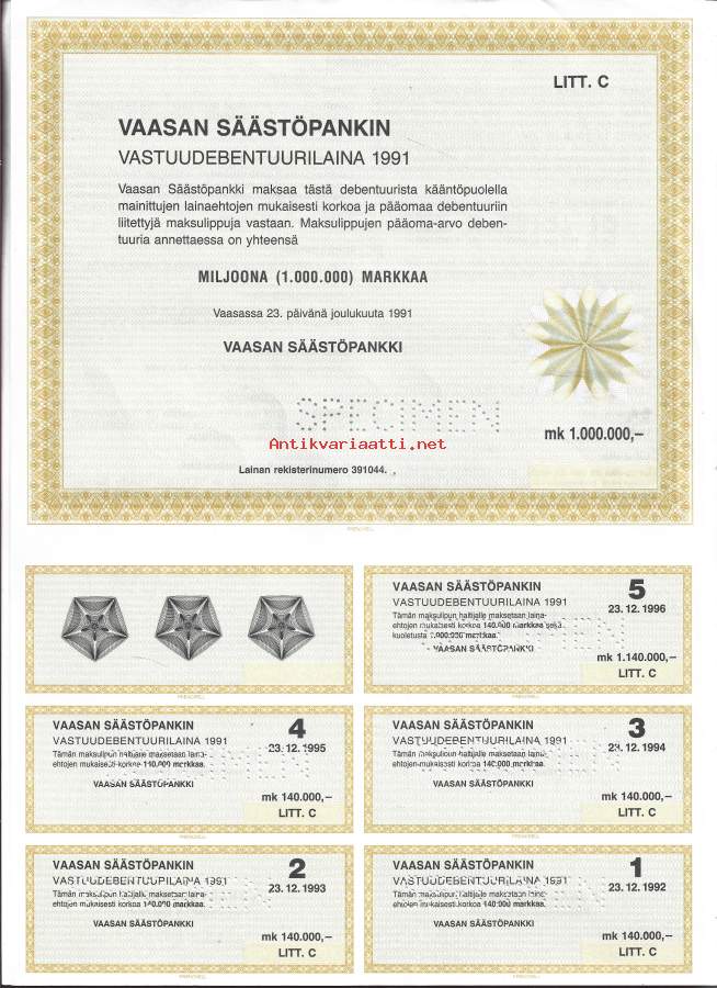 Vaasan Säästöpankki, Vastuudebentuurilaina 1991 specimen, 1 000 000 Mk Vaasa 23.12.1991