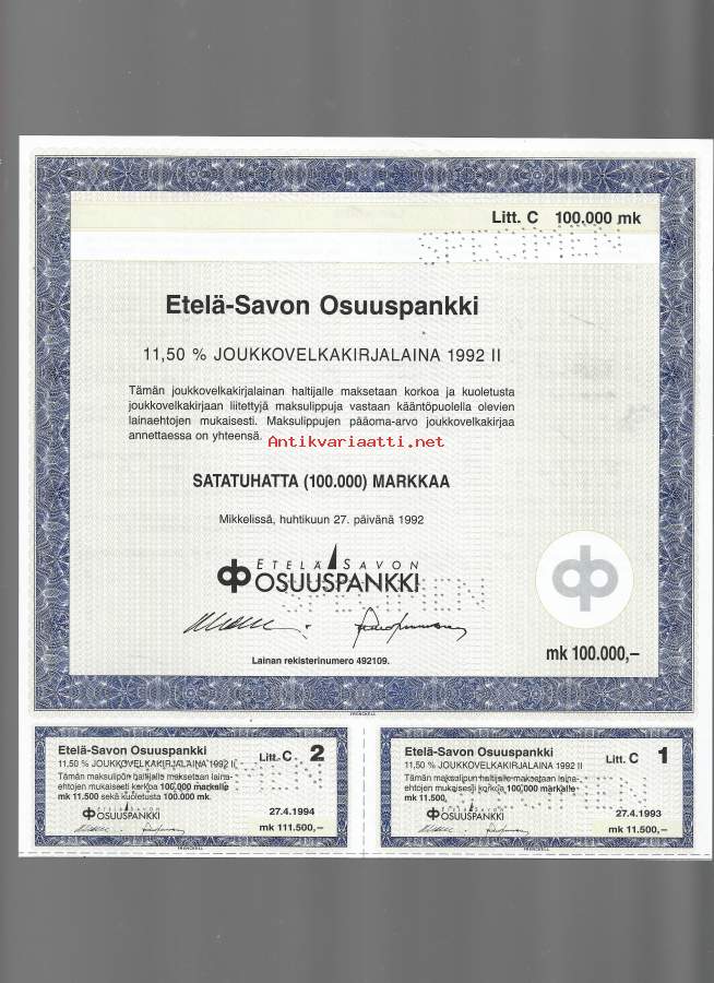 Etelä-Savon Osuuspankki Joukkovelkakirjalaina 1992 II 100 000 mk Mikkeli 27.4.1993, specimen joukkovelkakirjalaina