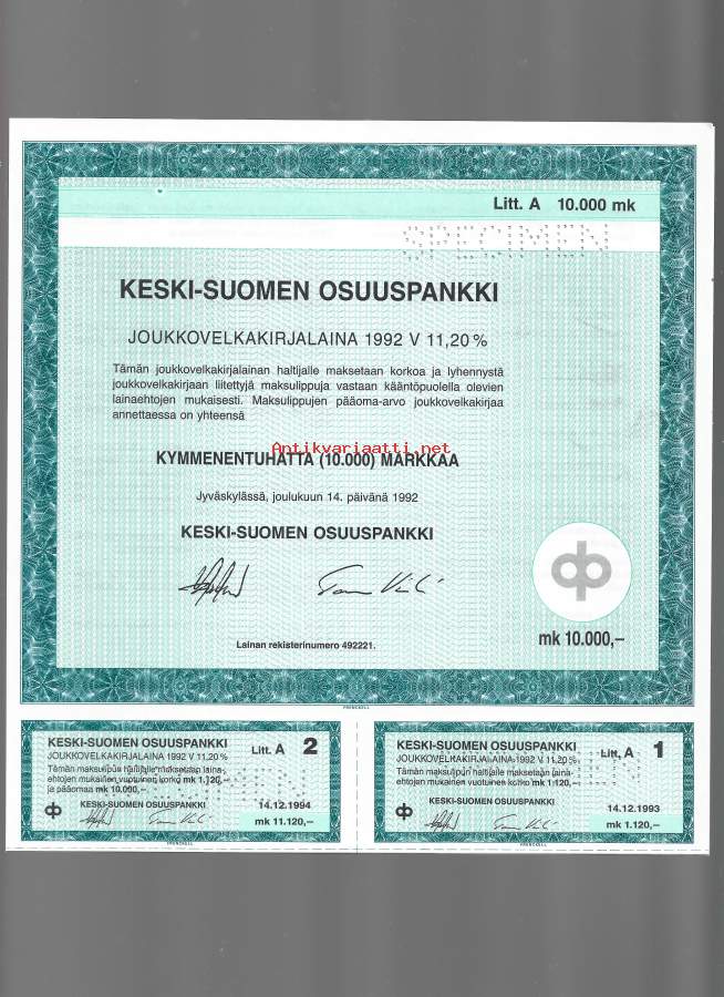 Keski-Suomen Osuuspankki Joukkovelkakirjalaina 1992 V 10 000 mk Jyväskylä 14.12.1992 specimen joukkovelkakirjalaina