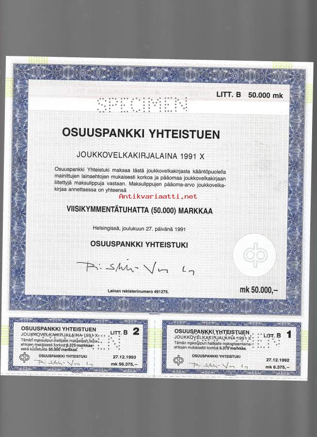 Osuuspankki Yhteistuki Joukkovelkakirjalaina 1991 X 50 000 mk Helsinki 27.12.1991, specimen joukkovelkakirjalaina