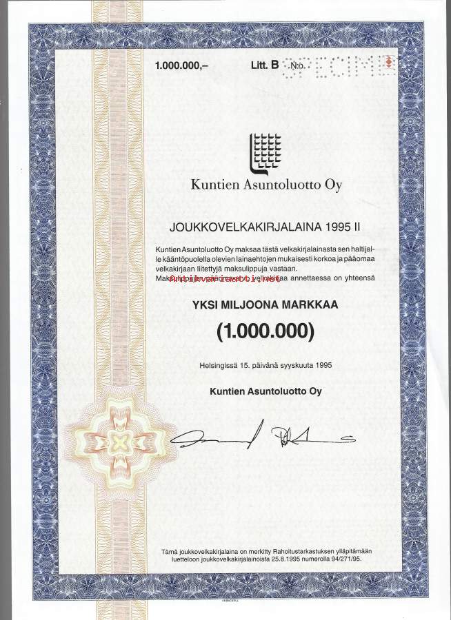 Kuntien Asuntoluotto Oy Joukkovelkakirjalaina 1995 II, 1 000 000 mk Helsinki 15.9.1995 specimen - joukkovelkakirjalaina