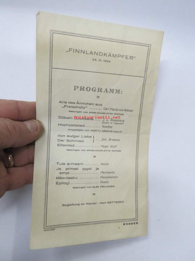 Finlandkämpfer 23.XI.1924 - Programm... -ilmeisesti Vapaussotaan sliittyvien juhlallisuuksien ohjelmalehtinen