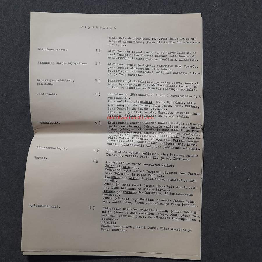 Oriveden kansalliset nuoret ote perustamis kokouksen pöytäkirjasta 18.9.1946