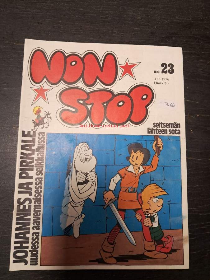 Non Stop 1977 nr 4 - Niilo Pielinen, Tintti, Corto Maltese, Veikko ja Tette ja Jykke, Piko ja Fantasio, Strumffaattori, Johannes ja Pirkale, Vili & Bill.