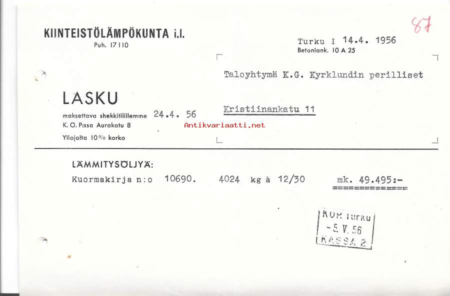 Kiinteistölämpökunta / Lämmitysöljyä Turku 1956 - firmalomake