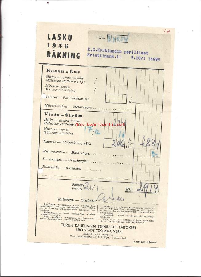 Turun kaupunki Tekniset laitokset Virtalasku / Vesiasku Turku 1956- firmalomake