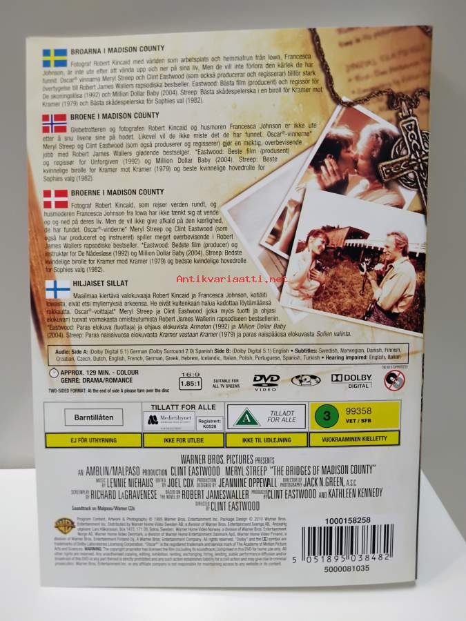 Clint Eastwood, Meryl Streep, draama/romantiikka, v.1995, 129min, suomitekstit, levy tyydyttävä, ei syviä naarmuja