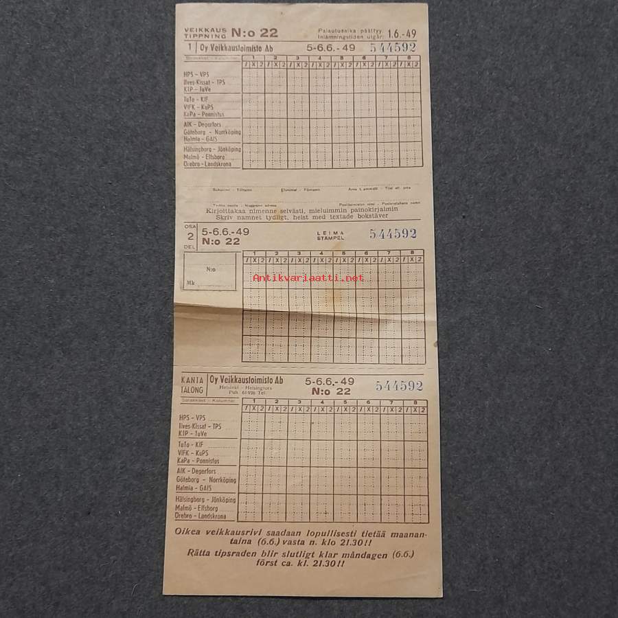Veikkauslappu veikkaus kuponki no.22 5'6.6-1949 peliaika päättyy 1.6.49