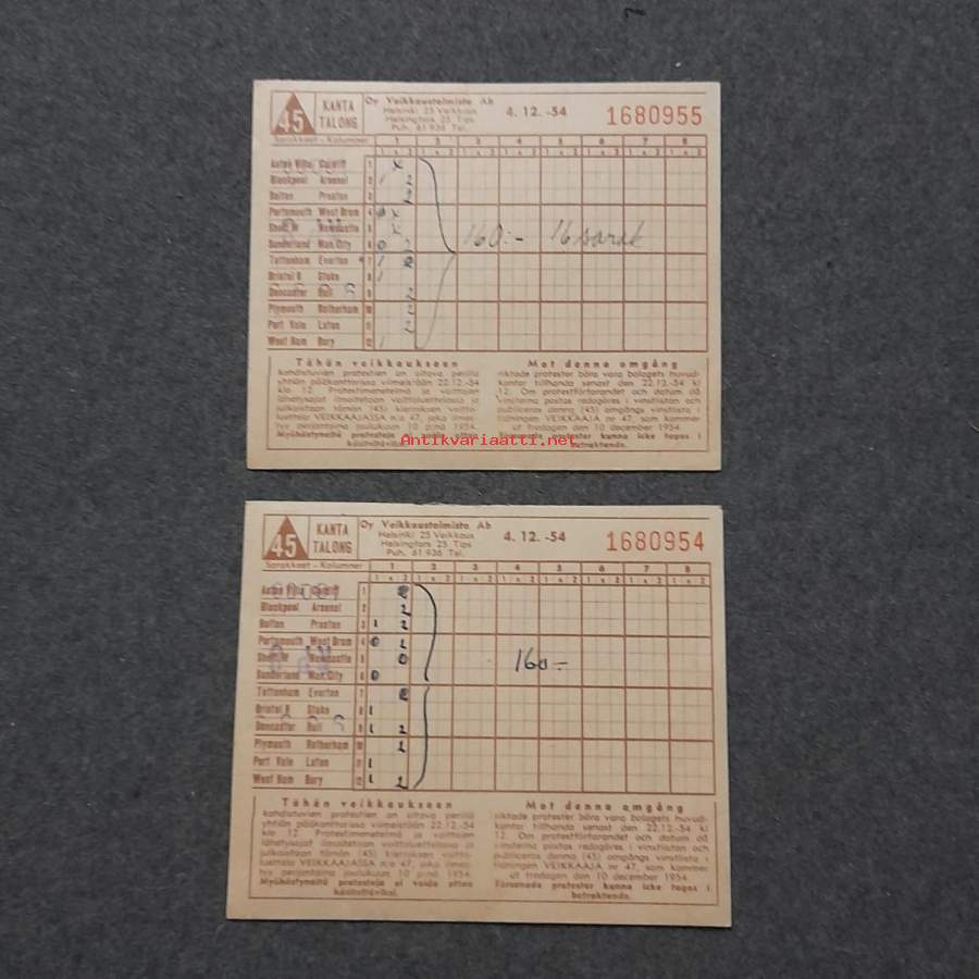Veikkauslappu veikkaus kuponki käytetty 2 kpl 4.12.54